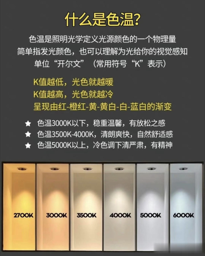 灯光的色温对空间氛围有着重要影响。暖黄色的灯光能营造出温馨、舒适的氛围,适合用于卧室和客厅;而白色的灯光则更加明亮、清爽,适合用于厨房和卫生间。可以根据不同空间的功能和需求,选择合适的灯光色温,让空间更加宜人。