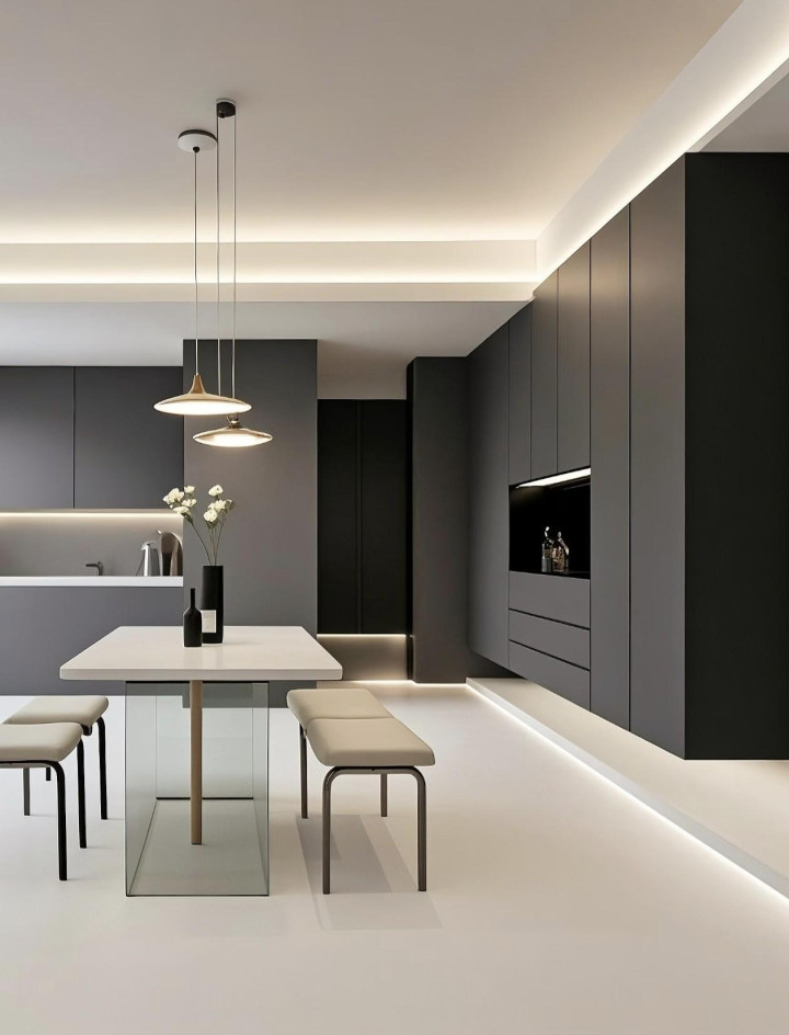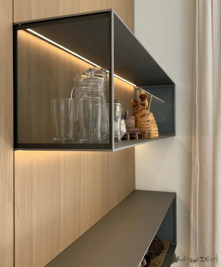 金属和玻璃元素的加入,能为空间注入现代时尚的气息。金色的金属边框可以用于装饰画框、灯具等,提升奢华感;银色的金属线条则可以用于家具的边缘装饰,增加精致感。玻璃材质可以用于隔断、柜门等,让空间更加通透,同时还能营造出一种朦胧的美感。